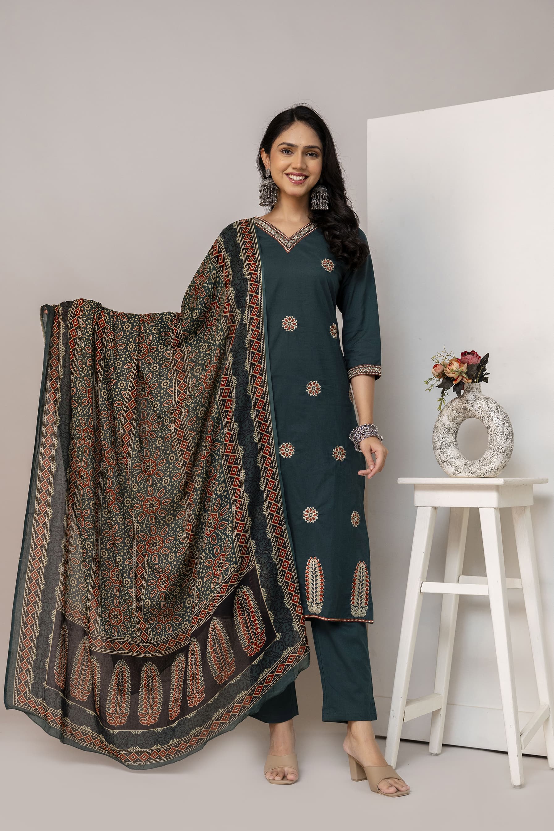 This suit set blends comfort with traditional charm, making it a must-have for your ethnic collection.