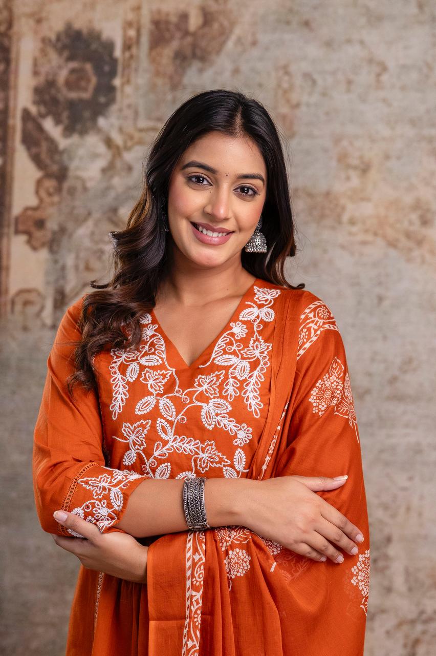 Premium Anarkali-inspired 3 pcs Cotton 60-60 Kurta, Pant & Dupatta Set with Intricate Neck Embroidery