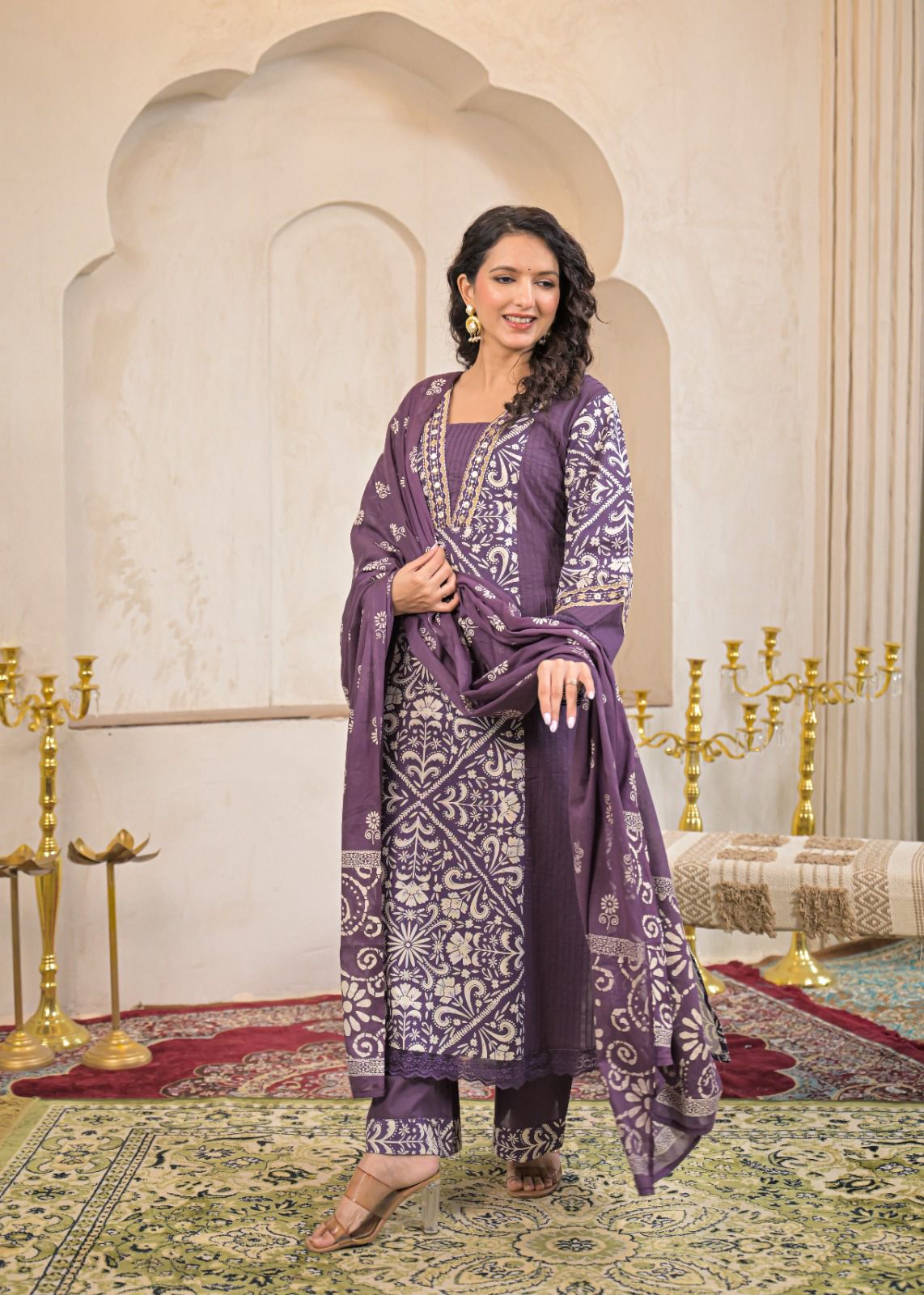 Woman Straight 3 Piece Set of Suit with Neck & Sleeve Embroidery
